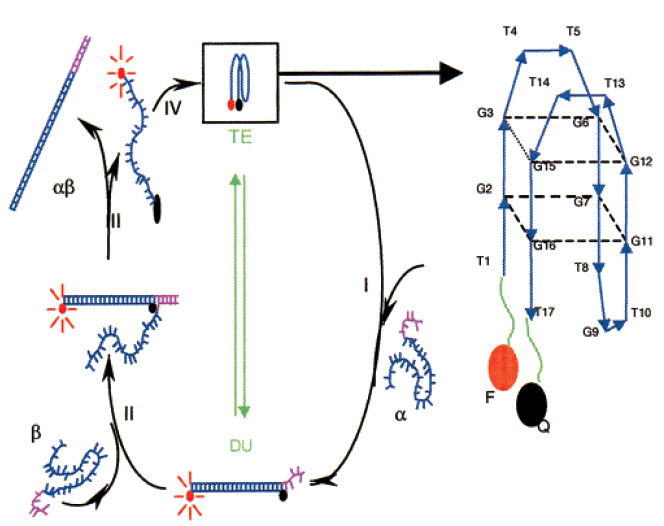 - Aptamer-gated DNA 나노로봇 장치의 오른쪽과 왼쪽에 Aptamer잠금장치 잠긴채 고정되어 있음.