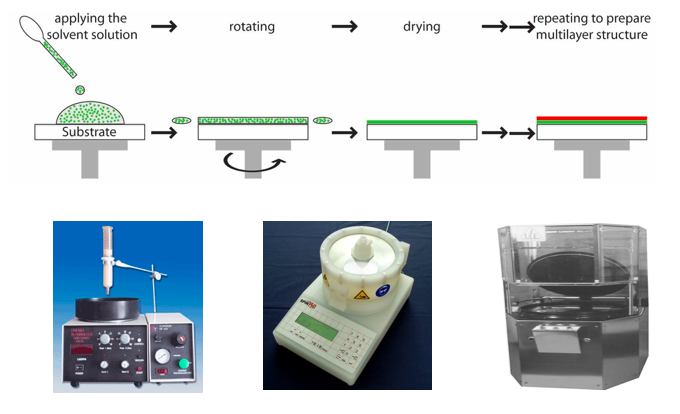 - 스핀코터 : 스핀코터는 평평한 웨이퍼나 평판에 얇게 막을 형성하는 것으로 박막 공정의 기본 장비이다. 평판 위에 코팅하고자 하는 물질(PR 또는 액상의 물질)을 놓고 회전을 시키면 얇은 막이 형성된다.