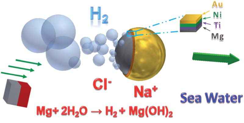 수소방울 추진 바닷물 동력 Janus Mg-based micromotor의 도식화이다.