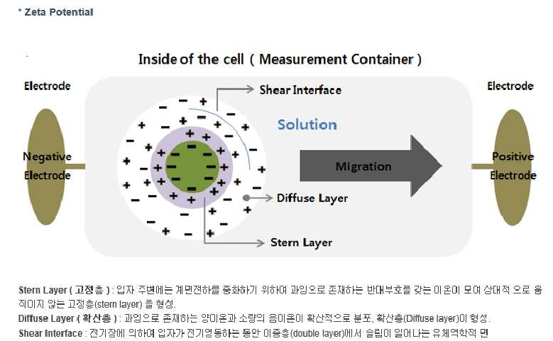 이러한 전기장에 의하여 입자가 전기영동하는 동안 이중층(double layer)에서 슬립이 일어나는 유체역학적 면이 나타나게 되는데, 즉 다시말해 파티클이 이동할 때 압축된 고정층(stern layer)은 파티클과 같이 움직이게 되지만, 이온확산층은 액상과 같이 움직인다.