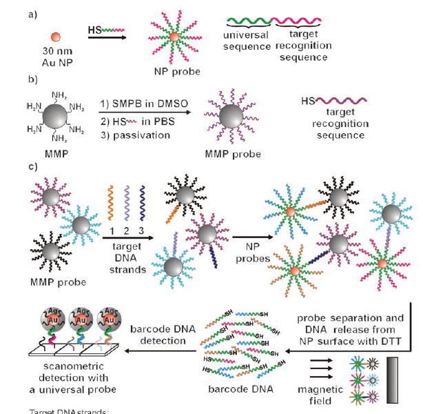 based on Au NPs functionalized with a large number of oligonucleotide strands(the barcodes) and a corresponding recognition agent (an antibody in the case of protein detection and a portion of the barcode strand that can recognize the target of interest in the case of nucleic acid detection)