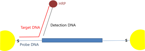- Au에 probe DNA를 달고, target DNA와 detection DNA가 sandwich