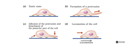 Cells have been known to move in the absence of external cues by random walk for many years. This process involves a cell’s formation of sequential dendritic pseudopodial protrusions which allow for motion that is reminiscent of ice skating [1, 14]. Conversely, chemotaxis is a continuous motion in which the polarized cell experiences protrusion, adhesion, traction, deadhesion, and retraction, as seen in Figure 3 [1, 15]. The Rho family proteins guanine triphosphate binding proteins (GTPases) are key regulators of protrusion formation. Rac, Cdc42, and RhoG are required GTPases for protrusion [3]. Protrusion is the forward movement of the leading cell membrane due to asymmetric actin polymerization [1, 5]. The actin cytoskeleton in the protrusions forms linkages with the extracellular matrix (ECM) which causes the cell to adhere to the substrate and move the leading edge along [1]. These adhesions stabilize the protrusions [3].Contractile forces generated by the myosin II molecular motor facilitates translocation of the cell through traction. Rear detachment and tail retraction complete one cycle of locomotion [1].