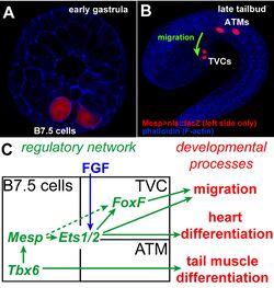 In ascidians, the so-called trunk ventral cells (TVCs) migrate from the anterior part of the tail to the ventral part of the trunk in tailbud embryos and constitute the precardiac mesoderm. They originate from a single pair of blastomeres in the early embryo, called B7.5 cells (Fig.1A). The B7.5 blastomeres give birth to the TVCs and their sister cells, the anterior tail muscles (ATMs), which differentiate into skeletal muscle and do not migrate (Fig.1B). Previous studies showed that TVC-specific gene expression and migration require transcriptional inputs from the bHLH transcription factor Mesp, the FGF signaling pathway and the forkhead transcription factor FoxF (Fig.1C). Because of these functional evidences, TVC migration constitutes a suitable model system to investigate the relationship between transcription regulation and directed cell migration.
