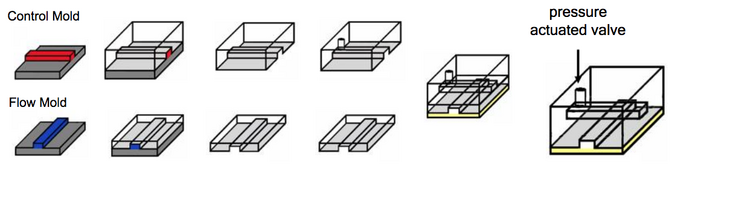 Multilayer Soft Lithography uses rubber as a base material and a series of channels transected by control lines. When pressurized, the control lines create an effective seal that allows for small structures and a dense network of channels to be fabricated on to a microfluidic device. The dense network of channels allows regulation of solutions and reagents in the micro-, nano- or even picoliter scale. The process begins by using a flat panel display (FPD) to generate mold features using a patterned photoresist, the first elastomeric layer is then formed on the fabricated FPD by encapsulating all the desired mold features. The first elastomeric layer is then joined onto a support substrate layer to allow for easier processing in the subsequent steps. Concurrently, a second elastomeric layer is formed using the same process described above, with the exception of the second layer not being bound to a support substrate. After formation of the two elastomeric layers, alignment and subsequent binding of the layers follow to produce a single monolithic elastomeric structure. Fabrication of the Nanoflex valve onto the device formed the foundation of Fluidigm's Integrated Fluidic Circuits (IFCs), which are used across a variety of genomics and proteomics applications [5,7].