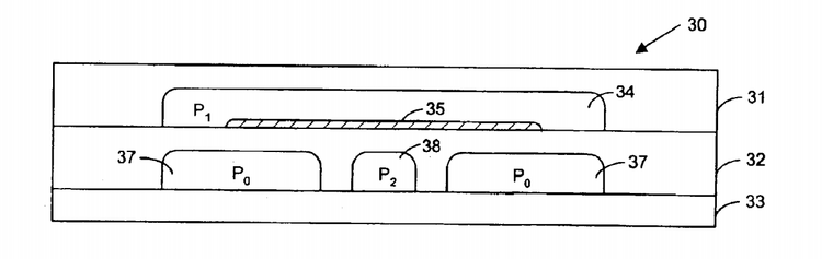 The Nanoflex™ valve has a simple rubber membrane that deflects under pressure to pinch off flow fluids in the microchannel. The valve is made from two distinct layers of elastomeric rubber formed in a micro-patterned mold. The rubber layers deflect precisely at the intersection of the channels in the bottom layer, creating a valve when pressurized liquid flows through the channels in one layer of the chip. Figure 3 shows the first embodiment of the micro-fabricated pressure amplifier system that employs the mechanism of the Nanoflex valve in the IFC. The system works by placing a fluid at pressure P1 in chamber 34. When pressure P1 increases above pressure P0 and P2 in chambers 37 and 38 respectively, a force is applied on the rigid layer 35 causing it to push against the movable walls of chambers 37 and 38, reducing its cross-sectional area and restricting flow in the bottom layer 38 which allows the flow of reagent solutions [8].