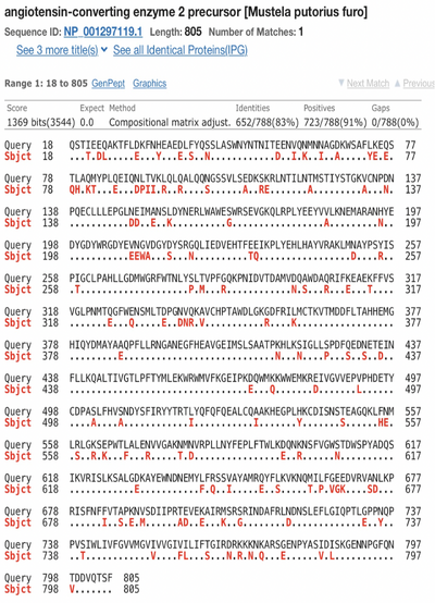 - Angiotensin converting enzyme 2 Domestic Ferret - Protein - NCBI. (2020). Retrieved 6 December 2020, from https://www.ncbi.nlm.nih.gov/protein/NP_001297119.1?report=fasta