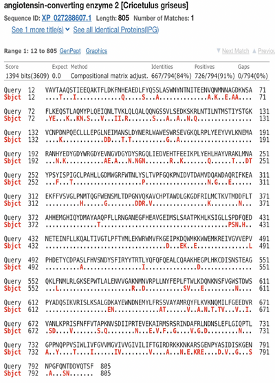 - Angiotensin-converting enzyme 2 Chinese Hamster - Protein - NCBI. (2020). Retrieved 6 December 2020, from https://www.ncbi.nlm.nih.gov/protein/AGZ48803.1?report=fasta