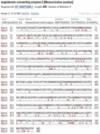 - Angiotensin-converting enzyme 2 Syrian Hamster - Protein - NCBI. (2020). Retrieved 6 December 2020, from https://www.ncbi.nlm.nih.gov/protein/XP_005074266.1?report=fasta