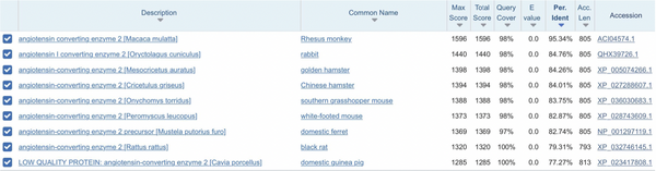 - Angiotensin-converting enzyme 2 precursor White-footed Mouse - Protein - NCBI. (2020). Retrieved 6 December 2020, from https://www.ncbi.nlm.nih.gov/protein/XP_028743609.1?report=fasta