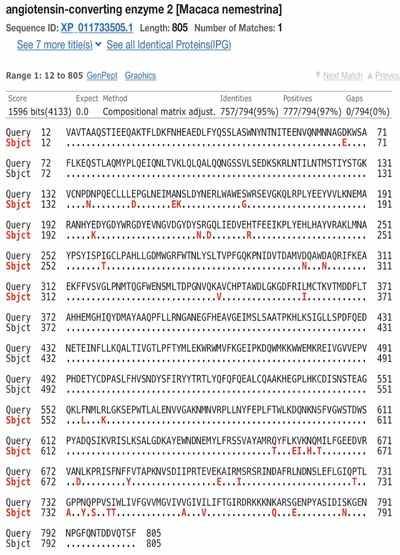 - Angiotensin I converting enzyme 2 Rhesus Monkey - Protein - NCBI. (2020). Retrieved 6 December 2020, from https://www.ncbi.nlm.nih.gov/protein/ACI04574.1?report=fasta