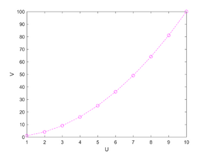 - The data used in this exercise is available on the Week 2 assignment page, which is linked at the bottom of this page. Both part one and part two of the assignment were completed in Matlab. For the first exercise I opened a new script in Matlab and defined two vectors U and V. Where U=[1,2,3,...,10] ad V=U^2. I then plotted the two vectors with V on the x-axis and U on the y-axis. I then saved this plot as figure 1. The plot is available in the top right hand corner of this page titled "Figure 1." For part two, I opened a new script in Matlab then defined 4 variables K, y0, tspan, and r. Here K is the carrying capacity and is equal to 10, y0 is the initial population size and is equal to 2, tspan is the timespan which ranges from 0 to 1 in increments of 0.01, and r is the growth rate of the population which took on values 0.5,1,1.5, and 2. I then constructed the population growth ordinary differential equation solution we covered in class using Matlab's ODE45 function. I concluded the script by plotting the solutions with time on the x-axis and population size on the y-axis.