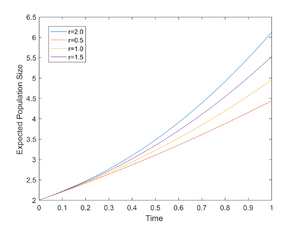 - Figure 1 is a simple model for exponential population growth. Consider the U vector to be time and the V vector to be population size, then it is clear that population size grows expontentially as time increases. Figure 2 is a solution model to the logistic growth differential equation that was covered in class with varying growth rates. The model only covers a time span of one, so it is clear that the population is still in the exponential growth stage where resources are more abundant. You can see at time=1, the growth rate of the population is beginning to slow, which is consistent with the theory discussed in class. As time passes, resources become more scarce and reproduction rates begin to decline. Eventually, the differential equation will have a vertical asymptote at the carrying capacity K=10. This means the population, y, will eventually settle at ten.