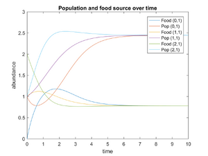 - For part 3, I opened another new script to define a new function, this time containing three differential equations. One equation for yeast growth 'x(2)', one for the first nutrient 'x(1)' and one for the second nutrient 'x(3)'.