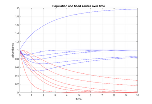 - I then opened a new script to plot the differential equations. I created plots of the growth of yeast/nutrients first varying initial conditions 'xO'. I used a time interval of 10 in increments of 0.01 for all of my plots.