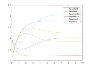 - For part 2, I opened a new script to define a new function, this time with a linear death rate on the population equation. To accomplish this, I added a new parameter 'm' for mortality. I then subtracted 'm*x(2)' from the population equation from part 1.