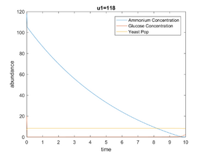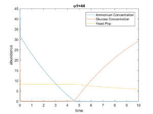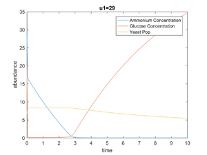 - For problem 3, a created a function in Matlab containing the differential equations in the multiplicative nutrient use model. I created globals for each of the parameters and made and c1, c2, and y were my state variables. I then wrote a script and set the parameters equal to the values given on the assignment page, but let u1 vary. I then plotted the solutions to the differential equations with u1 equal to the different concentrations used in the journal club paper.
