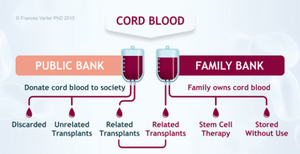 Cord blood banking is a service which basically offers science technology to help people preserve their cord blood. The cord blood today people are concerning about are mostly referring to the umbilical cord blood (UCB) which is a major source of primitive hematopoietic stem cells (HSC) and progenitor cells (HPC) that could be used for the treatment of certain diseases such as hematological malignancies, marrow transplantation, immunodeficiencies, hemoglobinopathies and inherited metabolic.[1][2] Currently, there are two major types of cord blood bank which are public and private. For the public bank, UCB of newborn infants could be donated to the bank by the consent of parents without any payment since the ownership of the UCB will belong to the bank after donation. And the inventory is available to the public and healthcare institution for them to look for partnership. However, for the private bank, the collection of UCB under parents' specific will and requires certain cost. The UCB in private bank is not accessible to public and will only for an autologous use such as the transplantation therapy of biological sibling.[3][4] Until 2016, there are 207 private cord blood banks over 54 countries and 158 international public cord blood banks in 36 countries with over 731000 units of umbilical cord blood.[4]