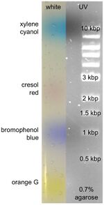 advantage: much less shadow on EtBr pictures unlike xylene cyanol and bromophenol blue