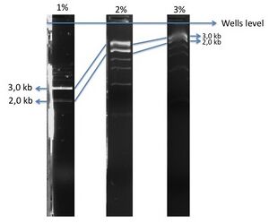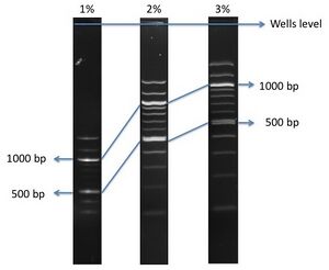 This experiment was aimed to show the different band separation in 1%, 2% and 3% DNA agarose gels. 1 kbp and 100 bp DNA ladders were used and run at the same time for 20 minutes at 100 Volts (~400 mA). The distance of bands traveling in the gels were compared. Ladder bands, especially the larger DNA molecules, were shifting towards the top of the gel as agarose concentration was increased.