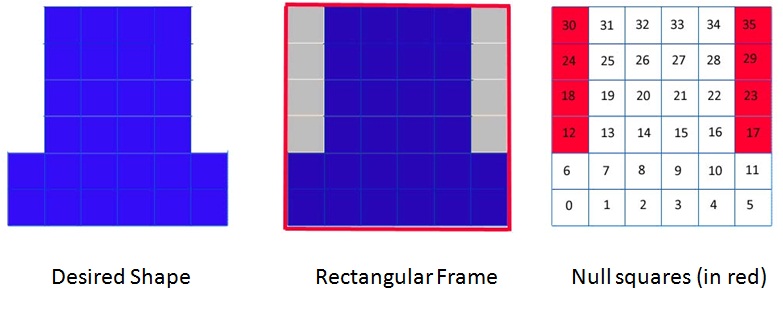In the above example, the desired DNA Origami shape is enclosed by a rectangular frame 6 squares x 6 squares. There are totally 8 null squares: 12,18,,24,30,17,23,29,35.