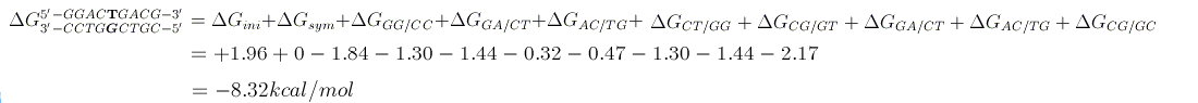- [math]\displaystyle{ \begin{align} \Delta H^o_{} (5'-CGTTGA-3') & = \Delta H^o_{ini} + \Delta H^o_{sym} + \Delta H^o_{AT term.} + \Sigma \Delta H^o_{stacking} \\ & = 0.2 + 0.0 + 2.2 + ( - 10.6 - 8.4 - 7.6 - 8.5 - 8.2) \\ & = -40.9 (kcal/mol) \\ \end{align} }[/math]