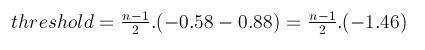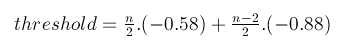To determine if the mismatched complement between the sticky ends and the scaffolds are stable or unstable, a threshold of binding energy ([math]\displaystyle{ \Delta G^o }[/math]) is required. Binding energy less than or equal to this threshold would be consider stable. There should not be an absolute threshold value for every DNA sequence with different length. Longer DNA sequences require lower [math]\displaystyle{ \Delta G^o }[/math] for a stable binding. Therefore, the threshold is set up as a variable calculated based on the sequence length: Let n be the length of DNA sequence. If n is even, the threshold is calculated as follow:
