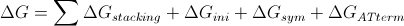 - [math]\displaystyle{ \Delta H^o_{} = \Delta H^o_{ini} + \Delta H^o_{sym} + \Delta H^o_{AT term.} + \Sigma \Delta H^o_{stacking}\! }[/math]
