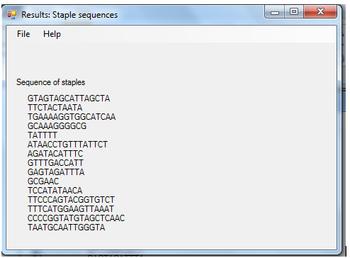 User can also ask the program to generate the sticky end sequence with the defined length. DNA sequences with binding energy higher than a limit defined are given. The below image illustrates the output of sticky ends' sequence generation.