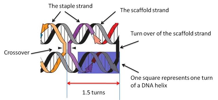 The next step in the Design part is the determination of crossover positions. Crossovers are the positions where the staple strands switch to bind to another segment of the scaffold located on the next row. The crossovers are crucial to the folding of the scaffold strand; in fact, they are the only linkages which prevent the helix from unfolding. The basic principle to determine the positions of crossovers was laid out by Rothermund: the spacing between crossovers in 2D DNA Origami structures must be an odd number of half turn. In other words, 2 vertically adjacent staples meet at their tangent points every an odd number of half turn. Thus, the staples will be in the least strained state at the crossovers. Particularly, in this project, we will stick to 1.5 turns as the unit for the spacing of crossovers.