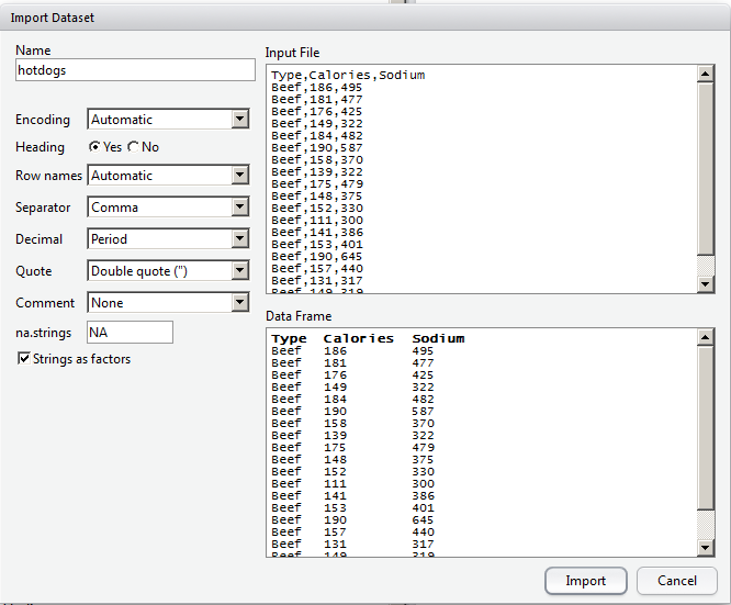 # previous data was read in, but not saved, so we are going to assign it to the variable hotdogs
