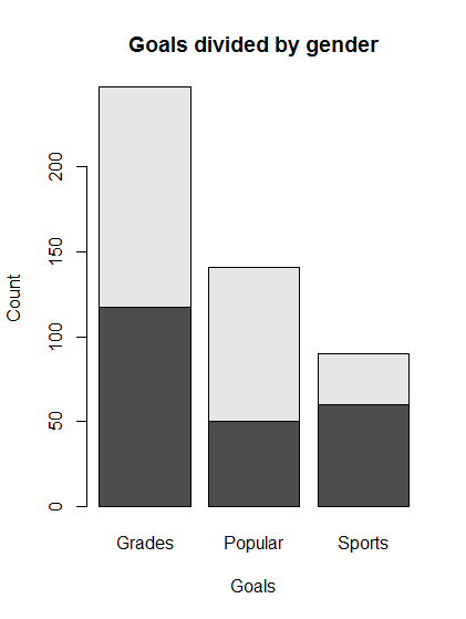 # Save a table of the two-way interaction genderGoals <- table(popularKids$Gender, popularKids$Goals)