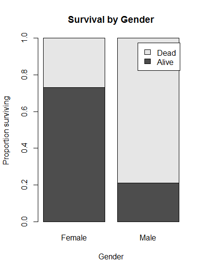# Make a table of gender by survival survivalGender <- table(titanic$survival,titanic$gender)