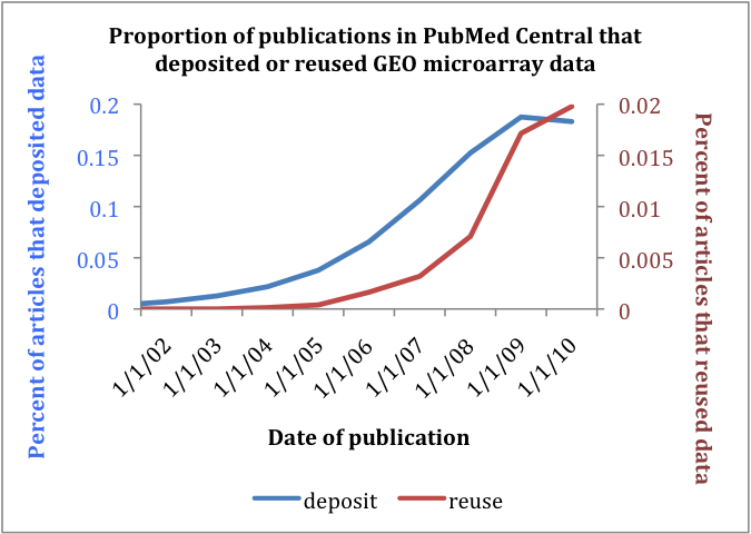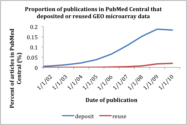 Proportion of publications in PubMed Central that deposited or reused GEO microarray data
