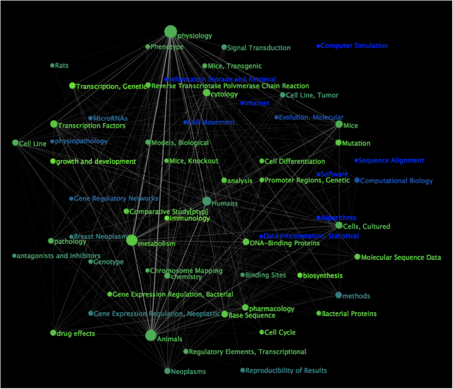 - Edge brightness = how often the connecting indexing terms are used to annotate the same articles