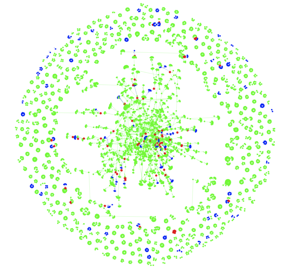 - Green edges = edges connecting authors to (tiny) depositing-articles nodes
