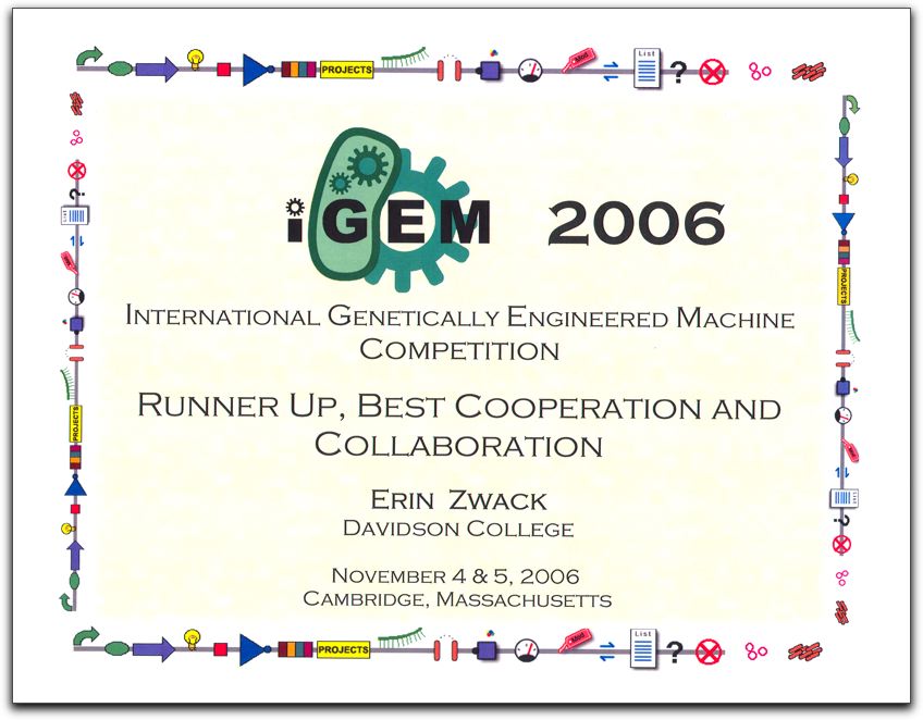 Certificates given to each member of the team for the following awards. Four undergraduates were on the Davidson team, so each name is shown once, though all four students won each of the awards.