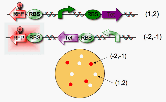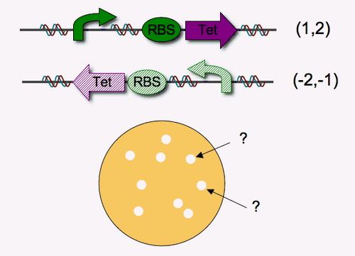 Mathematically, the permutations (1,2) and (-2,-1) are not hard to distinguish. However, in a biological system, these two are indistinguishable. Transcription can occur in either direction (either the plus strand or minus strand) as long as the promoter is facing towards the coding region. A promoter followed by RBS-Tet (1,2) and a reversed RBS-Tet followed by a reversed promoter (-2,-1) will both be expressed (tetracycline resistant). Colonies carrying either of these configurations will grow on media containing tetracycline (as illustrated below). Thus, (1,2) and (-2,-1) are biologically equivalent.