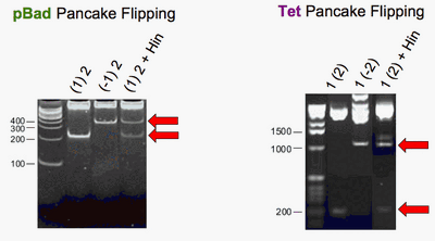 In a concurrent test to examine functionality of the Hin invertase <partinfo>BBa_J31001</partinfo> in our system, we checked for single pancake flipping in the presence of inducible Hin expression. Since we could not use tetracycline resistance to check for orientation, we used an NheI restriction digest instead. We expected Hin expression, and therefore DNA flipping, to be dependent upon pLac induction by IPTG. However, we observe flipping without induction.