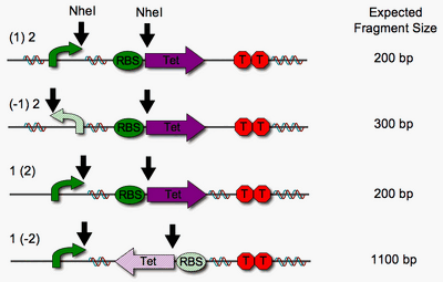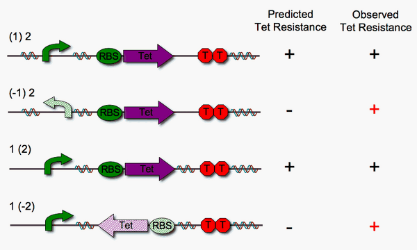 As illustrated above, we anticipated that the stacks in which one pancake is in the worng orientation would fail to show tetracycline resistance. However, we observe that this is not the case. We suspect that RBS-Tet is being transcribed via a promoter within the <partinfo>pSB1A3</partinfo> cloning vector backbone. Read-through is a major problem, since our system requires that transcription depends strictly upon proper order and orientation of the DNA pancakes.
