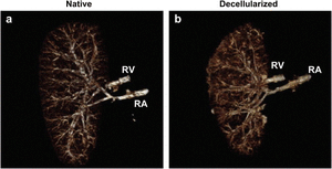 In 2013, Song et al reseeded a decellularized rat kidney with endothelial and epithelial cells. The process of recellularization, specifically the delivery of cells, was aided by the pressure gradient generated by a vacuum. Urine production of the recellularized kidney was detected, although the production is only 23% of the cadaveric kidney. The recellularized kidney was orthotopically implanted in rat. Urine production of the implanted kidney construct was found to be lower than the production from native kidney. Blood filtration was performed by the transplanted kidney. This proved that recellularized kidney that is orthotopically transplanted can perform the functions of native kidney, though he functions are performed to the same extent [5]. Long term effects of implanting the recellularized organ were investigated by Barbera et al in 2014. Aortic and pulmonary homografts were isolated from sheep, decellularized using perfusion bioreactor with SDS and Triton X-100, and implanted in sheep for 14-21 months. For both implanted decellularized aortic and pulmonary homograft, cells densities are higher at the outer part of the wall and the belly of the cusps. The overall densities of the wall and the cusps of the implanted samples were significantly lower in comparison to the native homographs. Immune rejection or other kinds of response were not present during the period of implantation [13].