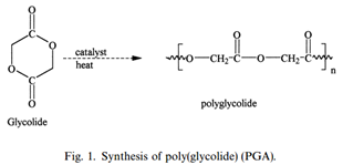 Synthetic homopolymer of glycolic acid in a braided multifilament. PGA has a uniform chemical structure, produced by the reaction of glycolic acid with glycolide to create linear polymer chains. The monomer of glycolide is created from the dimerization of glycolic acid in a ring opening polymerization, which does not occur in most organic solvents. The polymer is then processed in particular methods to create suture material with the desired physical properties, where it is subject to heat treatment. The homopolymer must be braided into a multifilament because PGA fibers are otherwise too stiff and strong for usage. The synthetic material is more uniform than its naturally-derived counterparts, and is broken down in the body by hydrolysis. PGA maintains 55% of its initial tensile strength 2 weeks after implementation [4], lose all strength by 4 weeks, and are fully absorbed after 4-6 months [8].