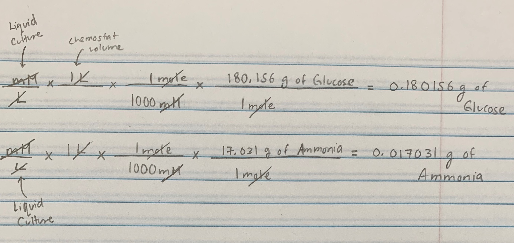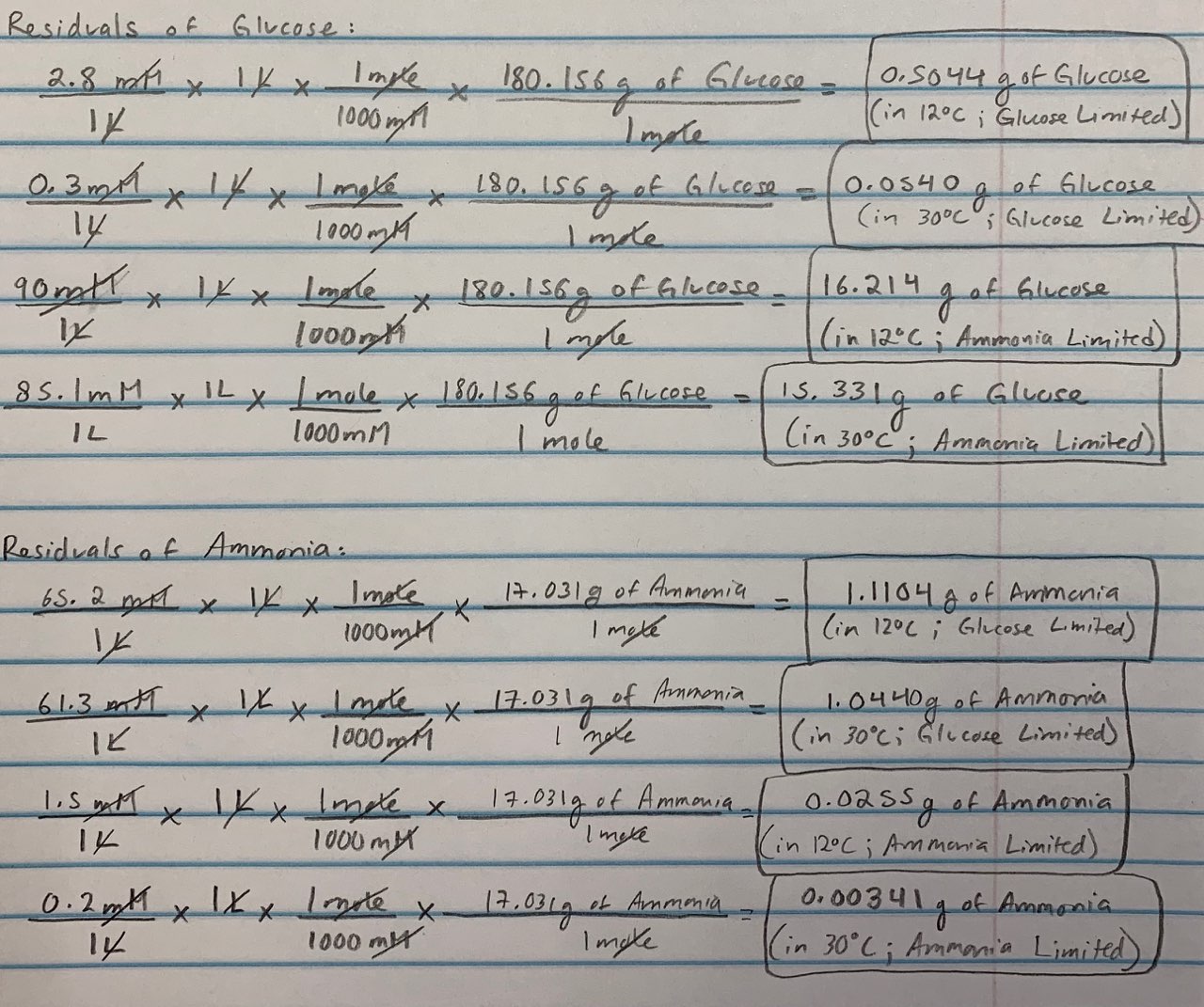 - Determine as many model parameters as you can from these data: use the "warm" data and both glucose- and ammonium-limited data. The parameters described below would need to be numerical values in order to be able to place them into our MATLAB simulation.