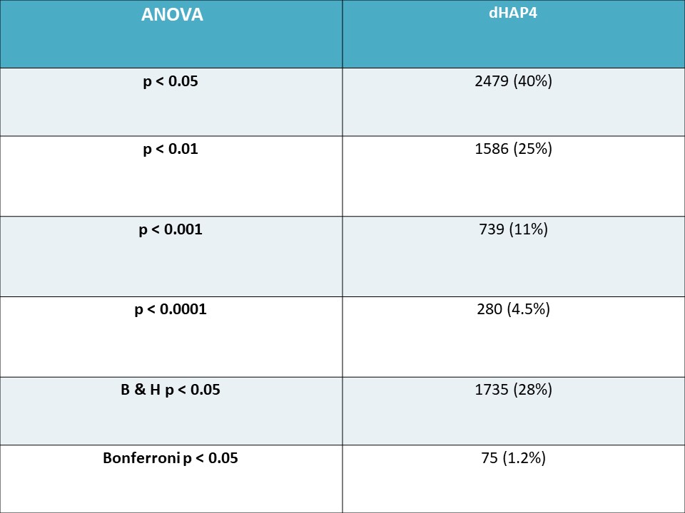Table 1: The number and percentage of dHAP4 genes found using unadjusted p-values and corrected p-values using the methods of Benjamini & Hochberg p-value Correction and Bonferroni and p-value Correction.