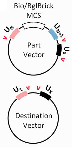 For example, let's say we've cloned genes A, B and C into part vectors U1U2, U2U3 and U3U4. In a three-part assembly, the U1U2 part vector would be cut around the U1 and U2 sites and the U2U3 part vector would be cut around the U2 and U3 sites. The last part, however (U3U4 vector) would be cut around the U3 and UX sites. This would yield the following linear DNAs: