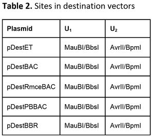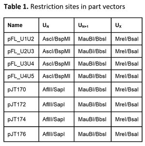 Because the last (most 3') part in the assembly must be cut with different restriction enzymes than the other parts, it is important to plan the restriction digests carefully to ensure proper assembly. A table of restriction sites that cut at each site on each of the available part and destination vectors is given below. Note that only ONE enzyme must be used per site. E.g. the U1 site of pJT170 can be cut with AflII or SapI; it does NOT require both.
