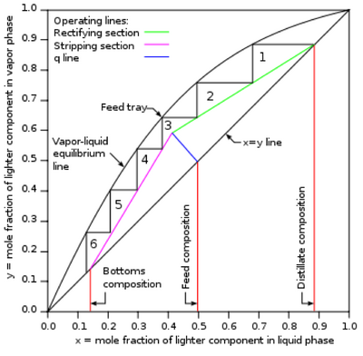 A McCabe-Thiele diagram depicts all of the governing equations on the same plot in order to model the distillation column at hand performing a specific separation with specific parameters. [4] A researcher can easily perform the analysis necessary to build a McCabe-Thiele diagram, with the desired product molar ratios, and determine how many trays or stages are necessary in the column in order to achieve the desired separation. Once constructed, a McCabe-Thiele Diagram looks like the following: