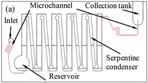 Distillation at the macro-scale is well studied, optimized, and extensively used in both industry and lab-scale settings. In general, separation at the micro-scale introduces a number of benefits: decreased separation times, increased performance, decreased costs, decreased use of reagents, and increased control over fluidic parameters. [7] However, in contrast to other separation techniques at the micro-scale, distillation poses a number of logistical issues when scaled down to the micro-scale. [8][9] For example, the vapor/liquid equilibrium nature of distillation is difficult to control and manipulate at the micro-scale, where capillary forces dominate over gravitational forces, a crucial component of macro-scale distillation. [10] Researchers have overcome these limitations by using inert carrier gases to guide the flow of vapor or using microfluidic channels lined with micropillars to guide the flow vapor and liquid. Using these techniques, researchers have been able to develop microfluidic distillation techniques that reap the benefits of scaling down.