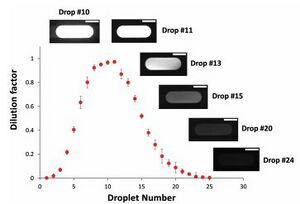 The serial dilution, also known as a stepwise dilution of a mother droplet operates under the principle that as droplets of buffer solution are added to a mother droplet of some set chemical concentration an output droplet will be produced with volume equal to buffer droplet and concentration as a function of of the diluted mother droplet. The concentration in each successive output droplet is reduced as a function of the droplet number and can be given via the below equation with [math]\displaystyle{ V_{M} }[/math] being the volume of the mother droplet and [math]\displaystyle{ V_{d} }[/math] being the volume of the output droplet.