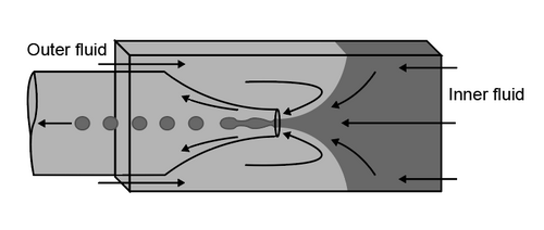 In order to understand the formation of droplets resulted from breakup of a coaxial flow, two mechanisms are defined, which are dripping and jetting. If dripping is taking place, the emulsion droplets form shortly after leaving the capillary tubes with the same diameter as the capillary orifice as shown in Figure 2b. This process happens at lower flow rates and typically produces highly monodisperse droplets. Alternatively, at higher flow rates, jetting would occur instead. In this process, the flow would breakup into droplets at about three or more orifice diameters after leaving the capillaries. Jetting usually produces polydisperse droplets with greater radii than the jet as shown in Figure 2c. Jetting can be caused when the large viscous stress of the outer fluid has a much larger viscosity than that of the inner fluid. Because in this case, viscous effects would dominate over inertial effect and lead to a low Reynolds number as a result.[2][4]